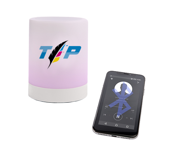 Questo speaker bluetooth non solo produce suoni di qualità, ma è anche bello a vedersi perché il corpo di plastica si accende in vari colori per creare fantasie ottiche e acustiche. Inoltre puoi personalizzare lo speaker bluetooth con il tuo logo, così i tuoi clienti e soci in affari sapranno chi offre la musica. Altezza 12,3 cm, diametro 9,6 cm, area di stampa 4 x 5 cm, stampa tampografica fino a 2 colori (PANTONE C, )illuminazione alternata. Colore di fondo: bianco, peso: 396 g con gancio inferiore per poterlo appendere, ad es. in tenda. Portata massima del suono 10 m, ricarica tramite presa mini-USB, radio incorporata. Consegna in box regalo a partire da 20 esemplari.