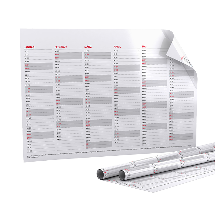 Stampa i tuoi planner annuali fronte-retro, ciascuno con sei mesi rispettivamente oppure sfrutta una facciata per la presentazione dei tuoi prodotti. Soprattutto all'inizio dell'anno, è il regalo perfetto a clienti e partner commerciali. Formato biglietti da visita fino a DIN A3, formato verticale o orizzontal, ediversi materiali disponibili, a partire da 100 copie.